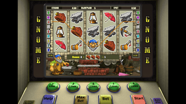 В видеослоте Gnome имеется 5 барабанов и 9 линий. Действует многоуровневая система ставок. Количество активных линий можно изменять. Стоимость одного кредита равняется одному рублю. Минимальная ставка на каждую линию — 1 руб., максимальная — 90 единиц игровой валюты.