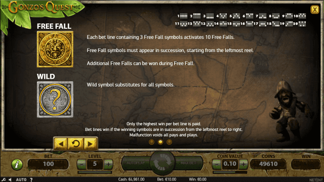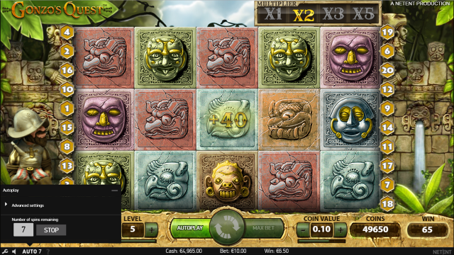 Азартный слот Gonzo’s Quest на приключенческую тематику, главный персонаж которого испанский конкистадор Гонзо. Перед началом игры гэмблер увидит мини-ролик, рассказывающий предысторию событий, в которых будет участвовать игрок. Герой постоянно присутствует на экране, он контролирует спины и реагирует на происходящее.